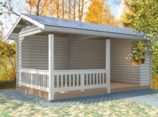 Пол застелен террасной доской из лиственницы. Навес крыт мягкой черепицей Shinglas, цвет которой вы можете выбрать сами. Летняя беседка ограждена парапетом с пересекающимися или вертикальными ламелями. Погонаж и крепеж входят в стоимость базовой комплектации. Площадь беседки – почти 25 кв.м.
