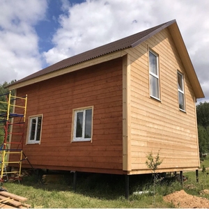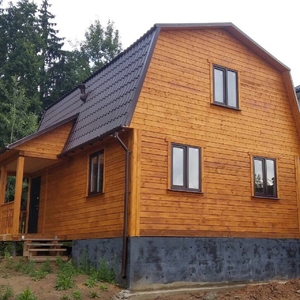 Дом в Липках – это оригинальный индивидуальный проект наших заказчиков. Размер сооружения 13х12 с просторной террасой. Для фундамента мы использовали металлические винтовые сваи, которые в дальнейшем зашили плитами ЦСП. Сам дом рассчитан для круглогодичного проживания, то есть применили утепление 200 мм., каменной ваты «PAROC». Наружная и внутренняя отделка имитация бруса, а в санузле и на террасе под плитку использовалась плита ЦСП. Высокая кровля позволила сделать полноценное чердачное помещение.