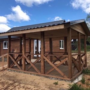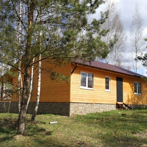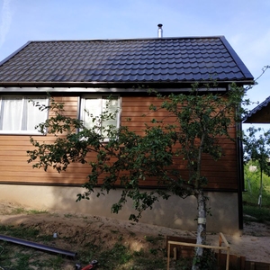 Проект в Смолевичах- это небольшой уютный домик дачный дом с двумя спальнями, санузлом, тамбуром и кухней-гостиной с распашными дверями, через которые вы попадаете в вместительную беседку с прекрасным видом на собственный благоустроенный дачный участок. Размеры дома 6х9 плюс беседка 4х2,5 , кровля накрыта металлочерепицей, цвет графит. Не большая кукушка над входом придаёт дому неповторимый шарм.