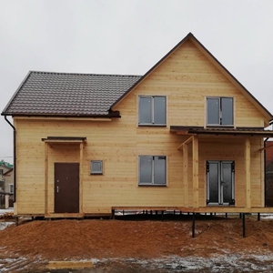 Дом в Чернице построен по каркасной технологии и предназначен как для межсезонного, так и для круглогодичного проживания. Мы немного изменили наш проект КД-4 с учётом пожеланий нашего заказчика, в итоге получился дом его мечты. Строение эстетически красиво и стильно выглядит, а большая терраса с видом на берёзовую рощу – это просто «бомба».