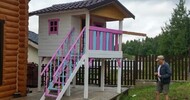 Наружная и внутренняя отделка имитация бруса, а в санузле и на террасе под плитку использовалась плита ЦСП. Высокая кровля позволила сделать полноценное чердачное помещение.